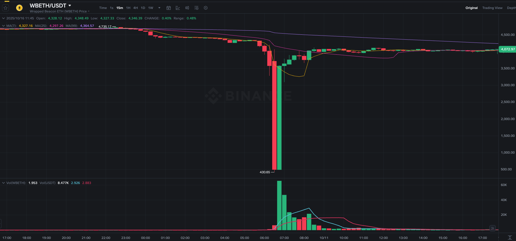 11日早朝6時過ぎ、Binanceのスポット市場で異常な動きが検出された。 USDe、wBETH、BnSOLなどの担保トークンが突如暴落。 他取引所では価格は安定していた。 つまり、Binance内部だけが崩壊していたのだ。