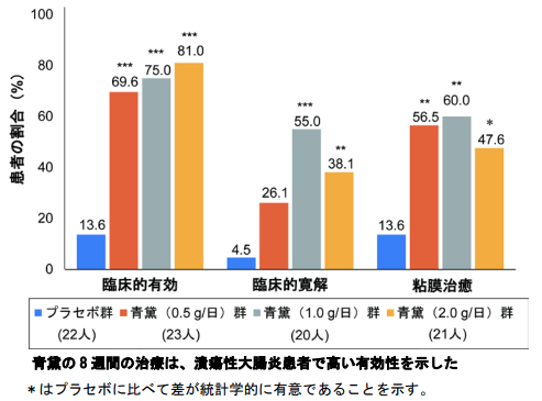 さらに、症状がほぼ消失した状態である「臨床的寛解」や、内視鏡で見て大腸粘膜の炎症が治癒している「粘膜治癒」を達成した患者の割合も、青黛群がプラセボ群を大きく上回りました。